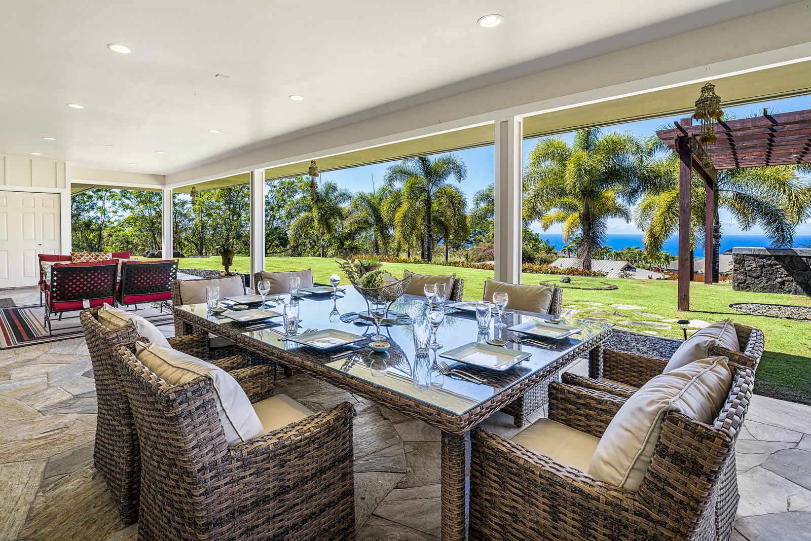 Sitting on one acre of land on the west side of the Big Island, and close to the popular dining and shopping street of Ali’i Drive in Kona, lies Elua Honu. Enjoy the palm trees and ocean views while grilling on the BBQ and dining outdoors on the spacious lanai, which connects to yet another dining area and the large kitchen.