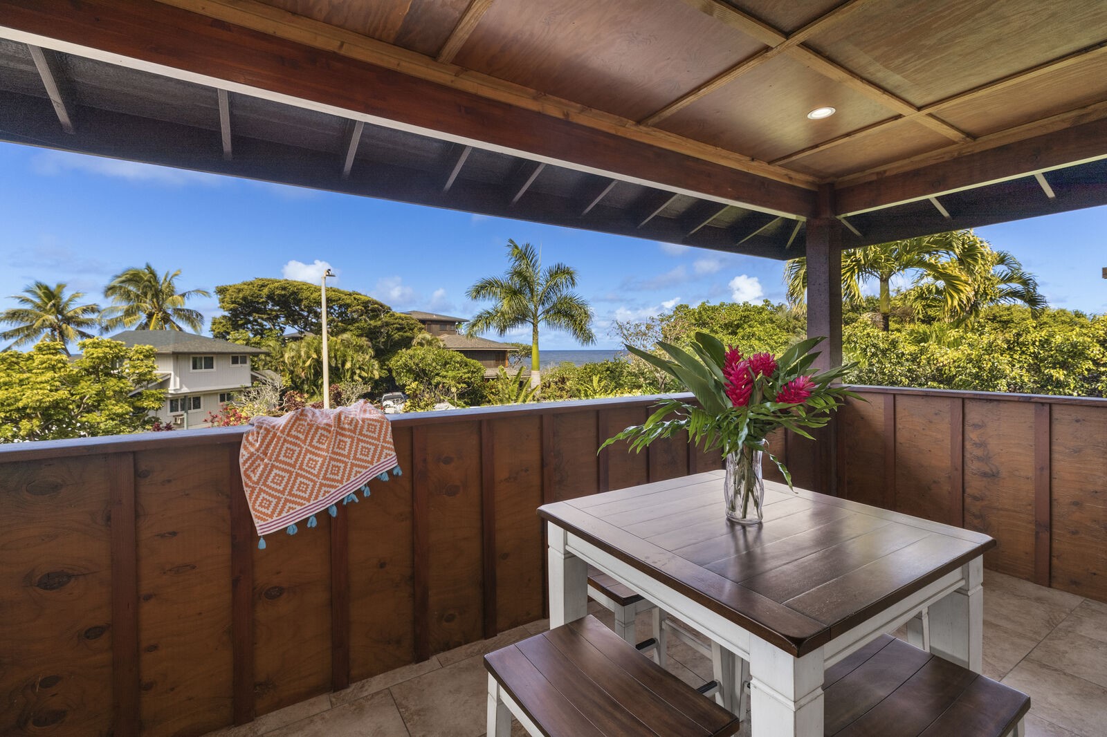If you’re looking for a bright home with high ceilings and unique finishes, Half Moon Hana on Kaua’i is the place for you. Close to gorgeous Hanalei Bay, the Princeville Botanical Gardens, and multiple white-sand beaches, this newly-remodeled property has a wet bar and a wine cooler in the beautifully finished kitchen.