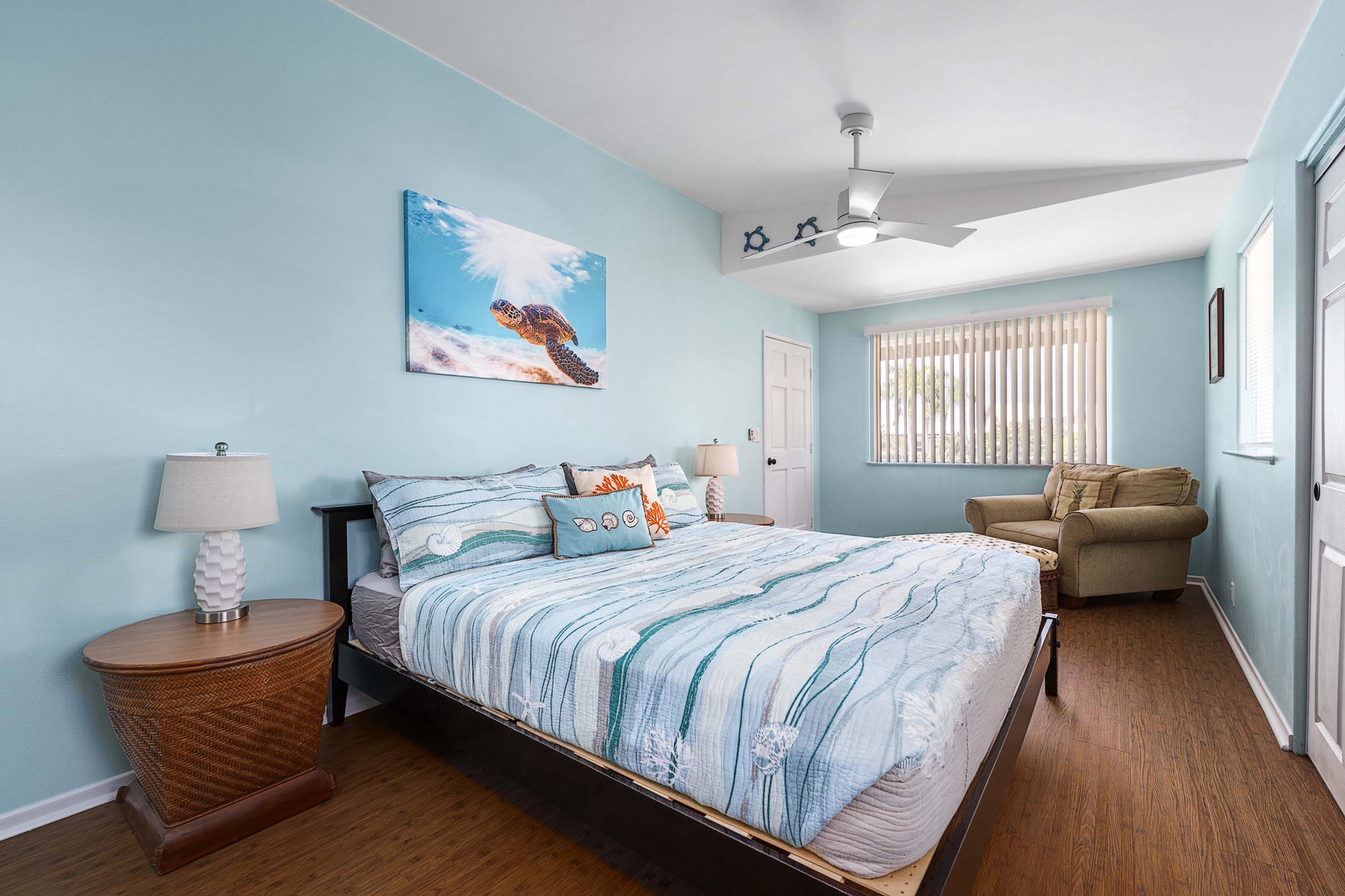 A large driveway, able to accommodate up to four vehicles, along with pleasing tropical landscaping greets you as you pull up to your Big Island vacation rental. As you step inside, the open-concept living space is vivid and inviting, with colorful island-inspired art pieces hung along the walls. The kitchen contains stainless steel appliances, including a dishwasher, and ample cabinet space that holds all of the tableware and utensils you need to prepare a proper meal. The window above the kitchen sink provides bursts of sunlight that illuminate the space, and the ceiling fan offers substantial airflow to keep you cool while you’re cooking. Enjoy your meals in the cozy breakfast nook, or spread out at the massive dining room table adjacent to the living room. The bright paint colors add to the beachy ambiance of the living room, with its welcoming furniture and large flatscreen TV. Sliding glass doors bridge the indoor living space with the outdoor patio, with more than enough space to gather for a BBQ and dining al fresco.