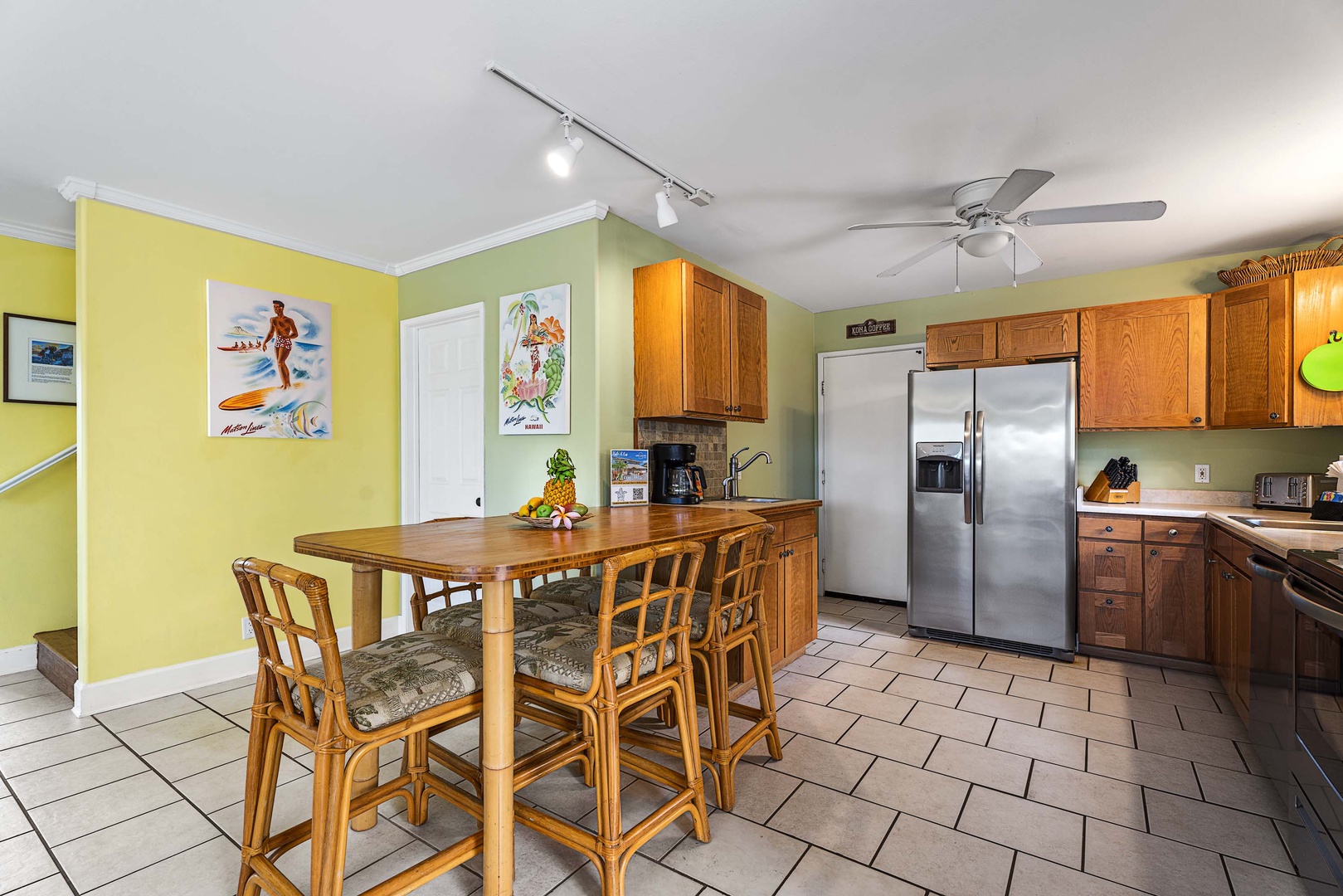 The primary bedroom comes complete with a King-size bed, access to a sizable outdoor lanai, as well as its own well-appointed ensuite bathroom with double sinks and a shower/tub combo. The second and third guest bedrooms both have plush King-size beds, as well as their own private ensuite bathrooms. The fourth bedroom is perfect for kids, containing two Twin-size beds with a bathroom nearby. All of the bedrooms are equipped with air conditioning with 4-hour timers and ceiling fans, ensuring your comfort on those balmy island nights.