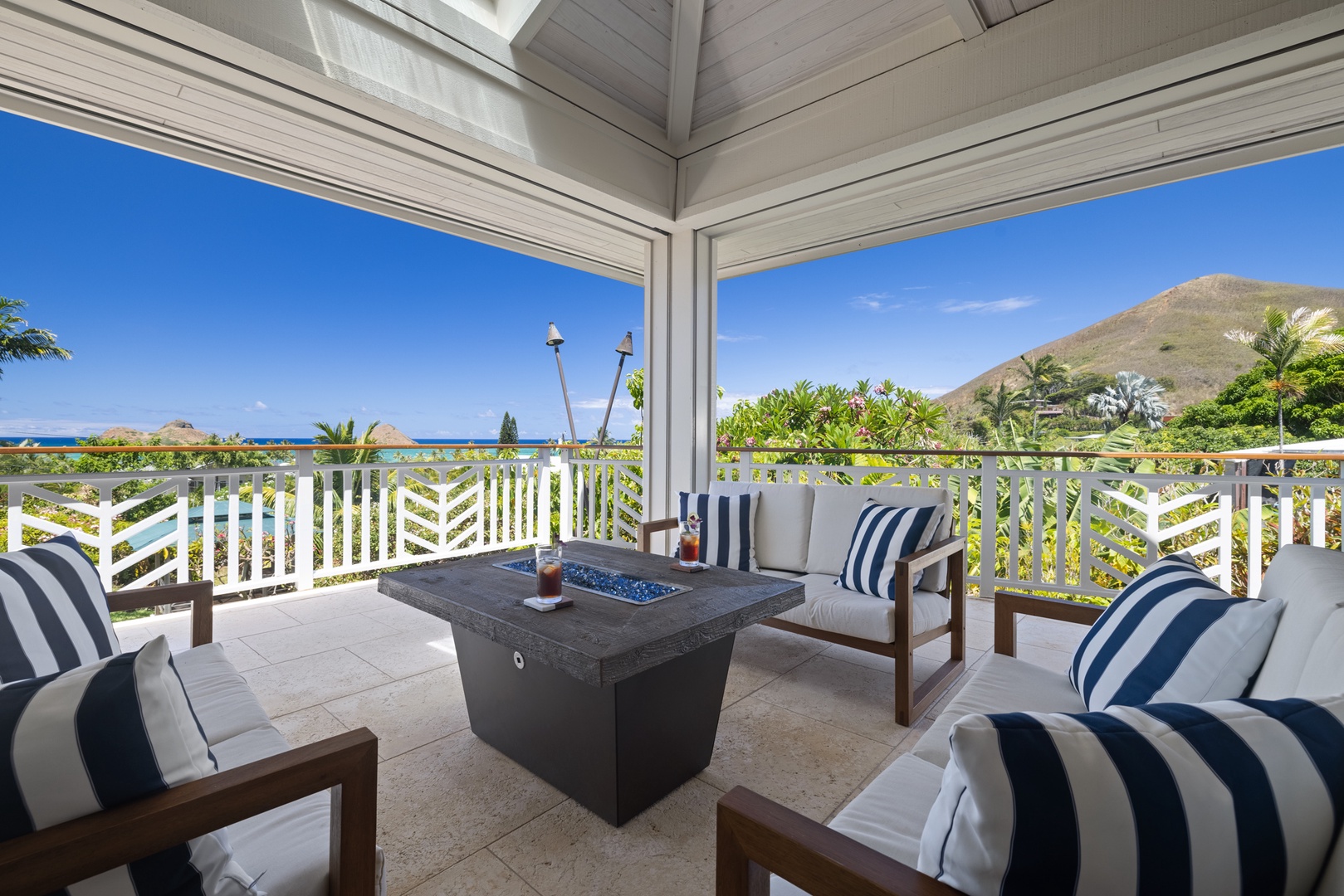 Unwind in the primary suite's lanai with ocean views and fire pit.